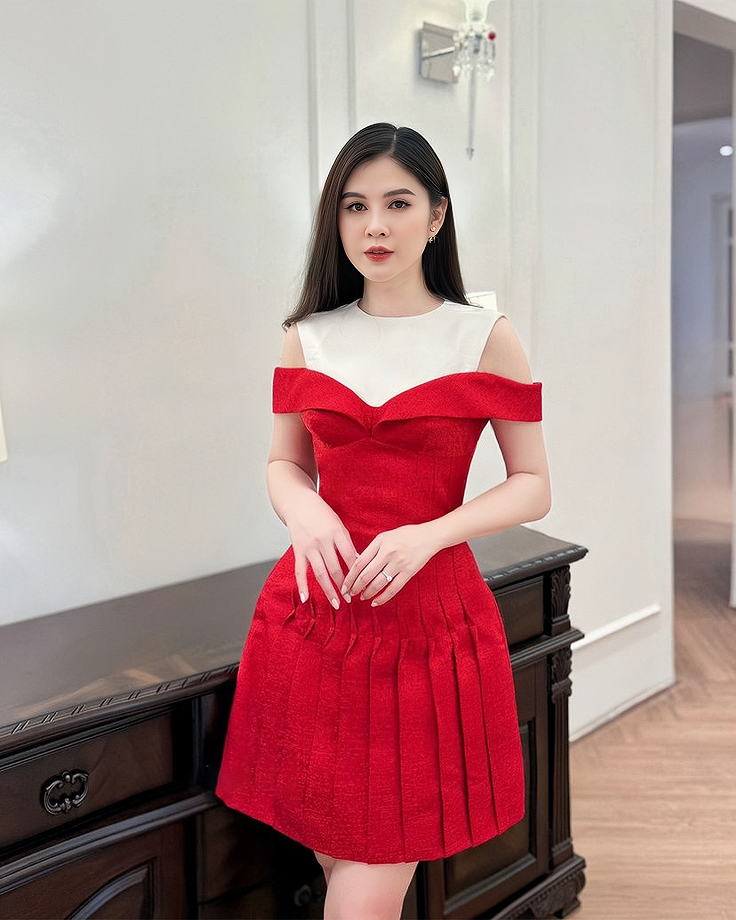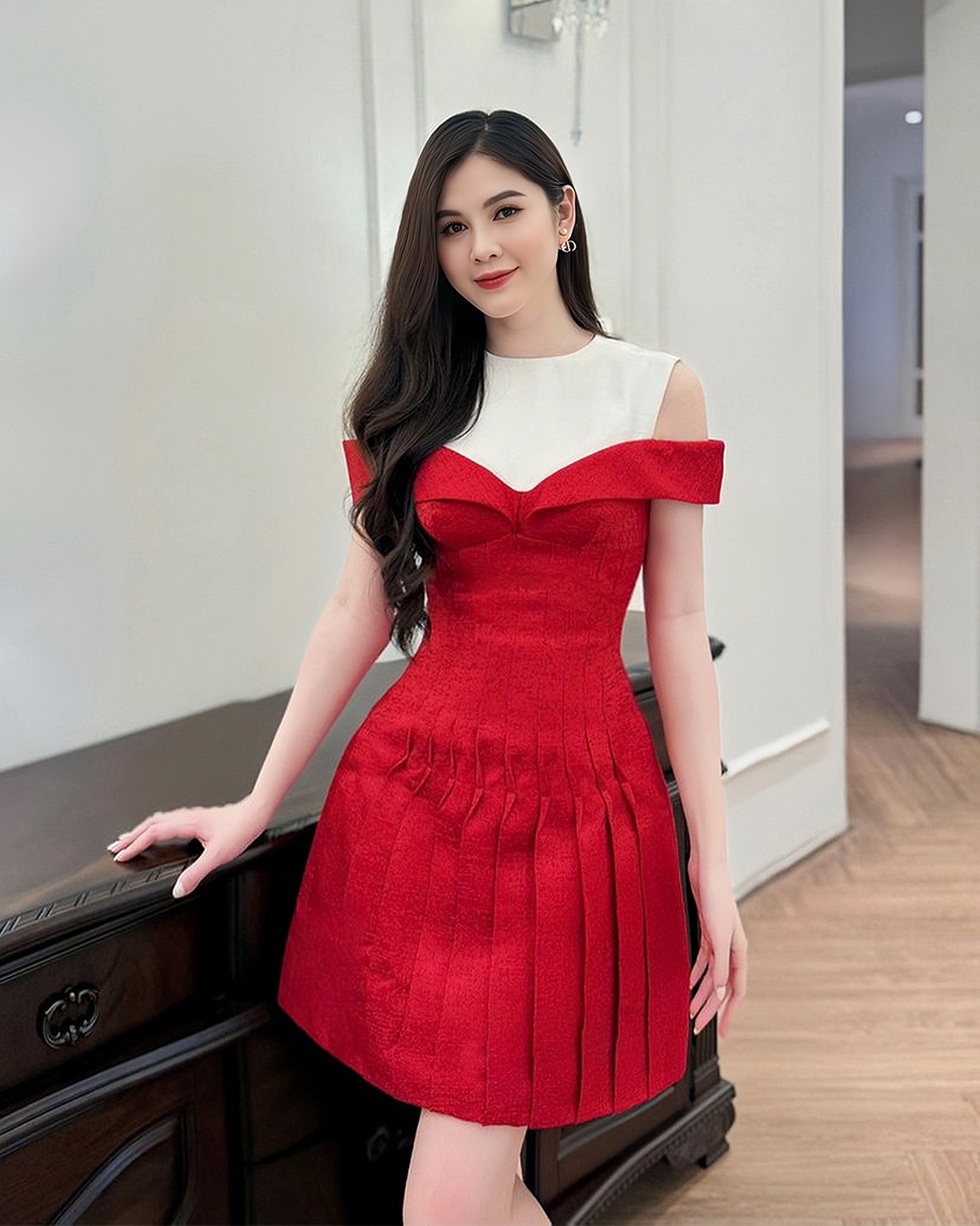 Enhance your fashion quotient with our enchanting two-tone dress. The off-shoulder allure and tailored waist design combine to create a chic and sophisticated appearance, making it the perfect choice for any special occasion.