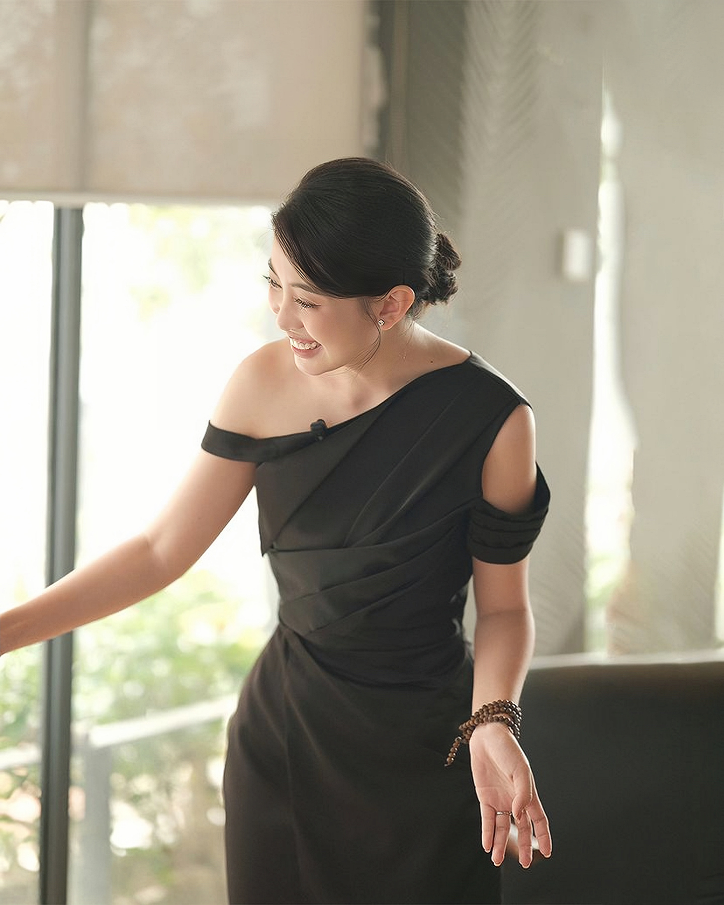 Revel in the allure of this attire showcasing an off-shoulder design with a stylish asymmetrical touch, complemented by graceful draping - all meticulously fashioned from opulent Silk Taffeta.