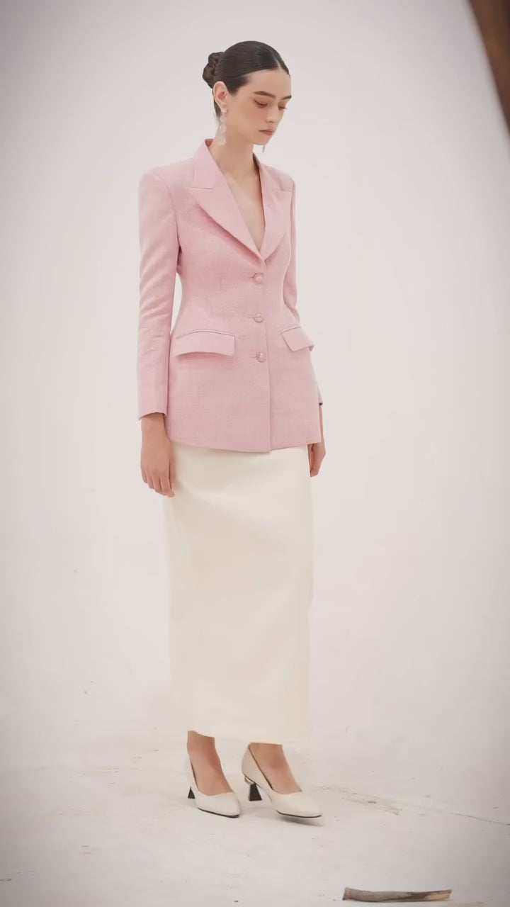 The Rosie Blazer stands out with its soft pink and cream tones, exuding a gentle and feminine elegance. Designed with a fitted waist and subtly flared hips, this blazer beautifully enhances natural curves, creating a look that is both sophisticated and alluring. Perfect for adding a touch of graceful charm to any outfit.